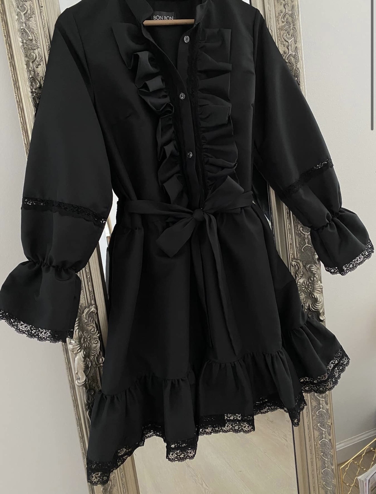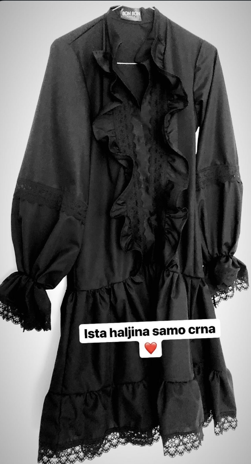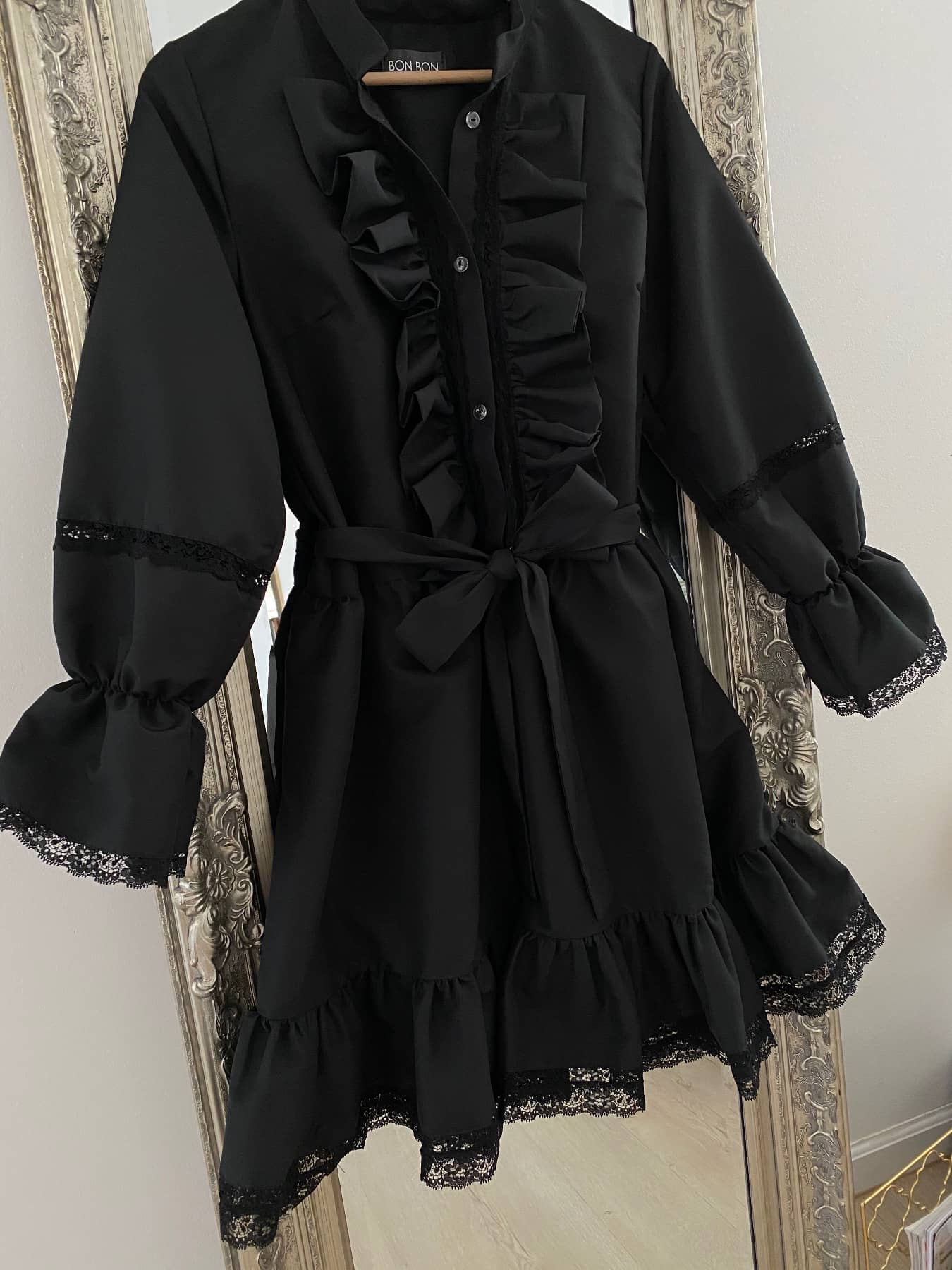 Black cotton dress with lace details.