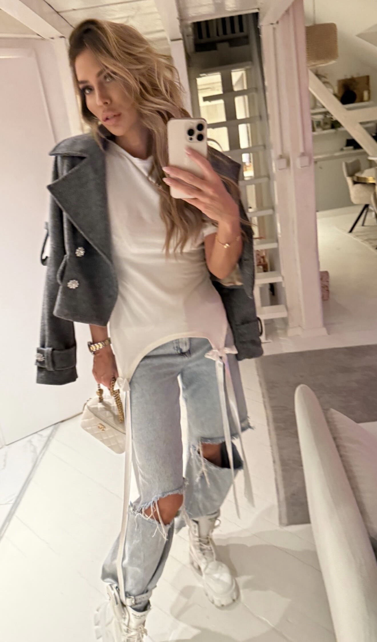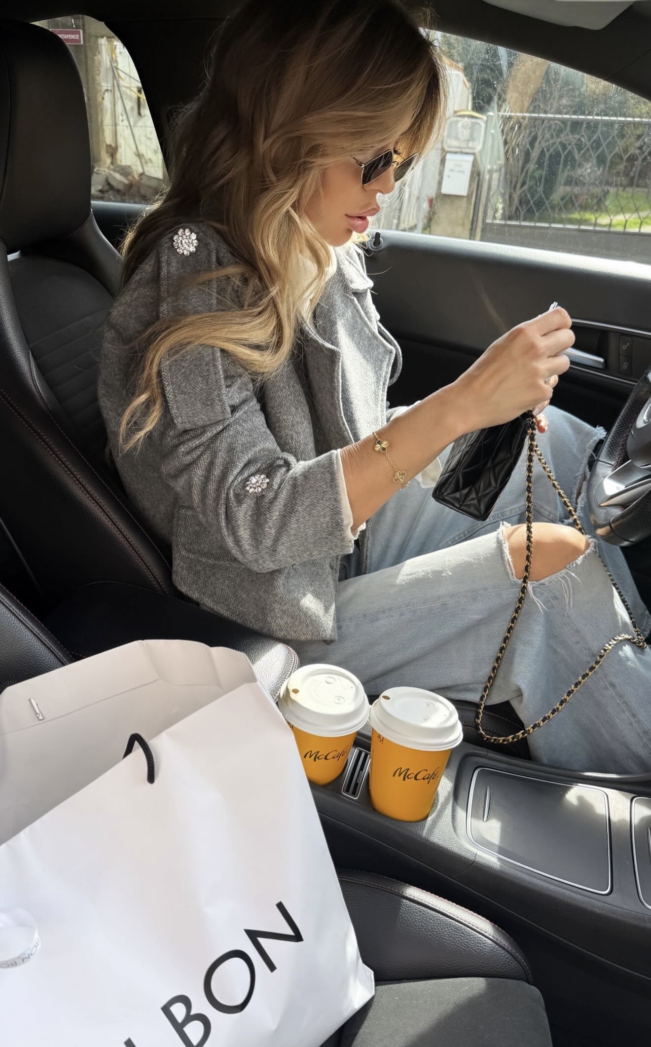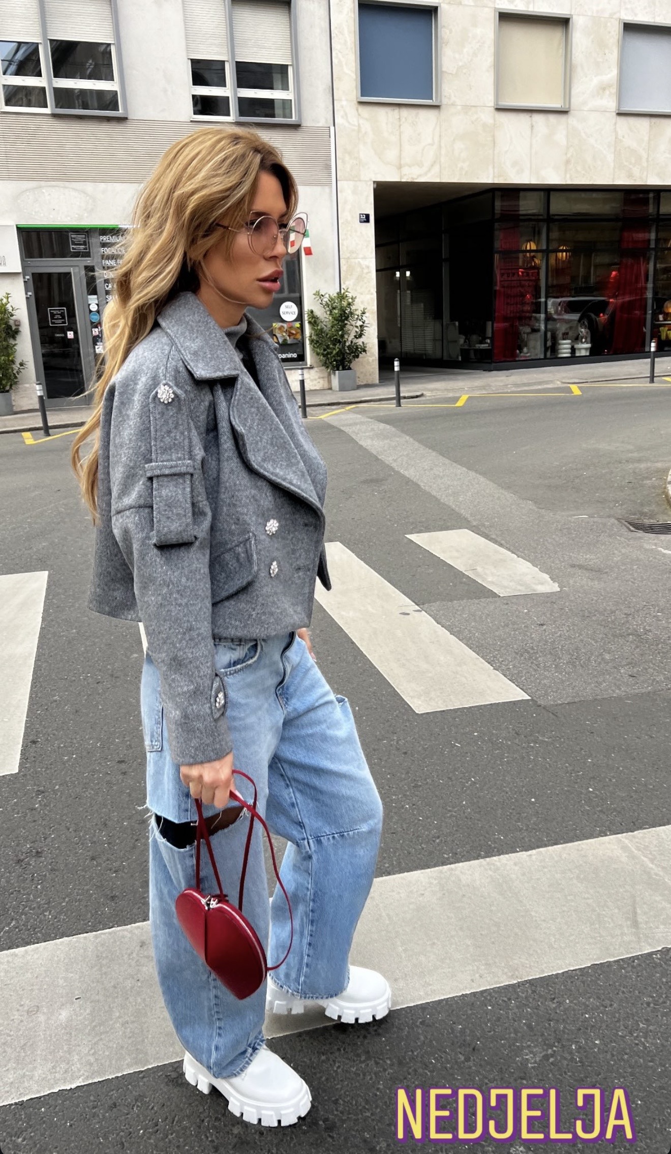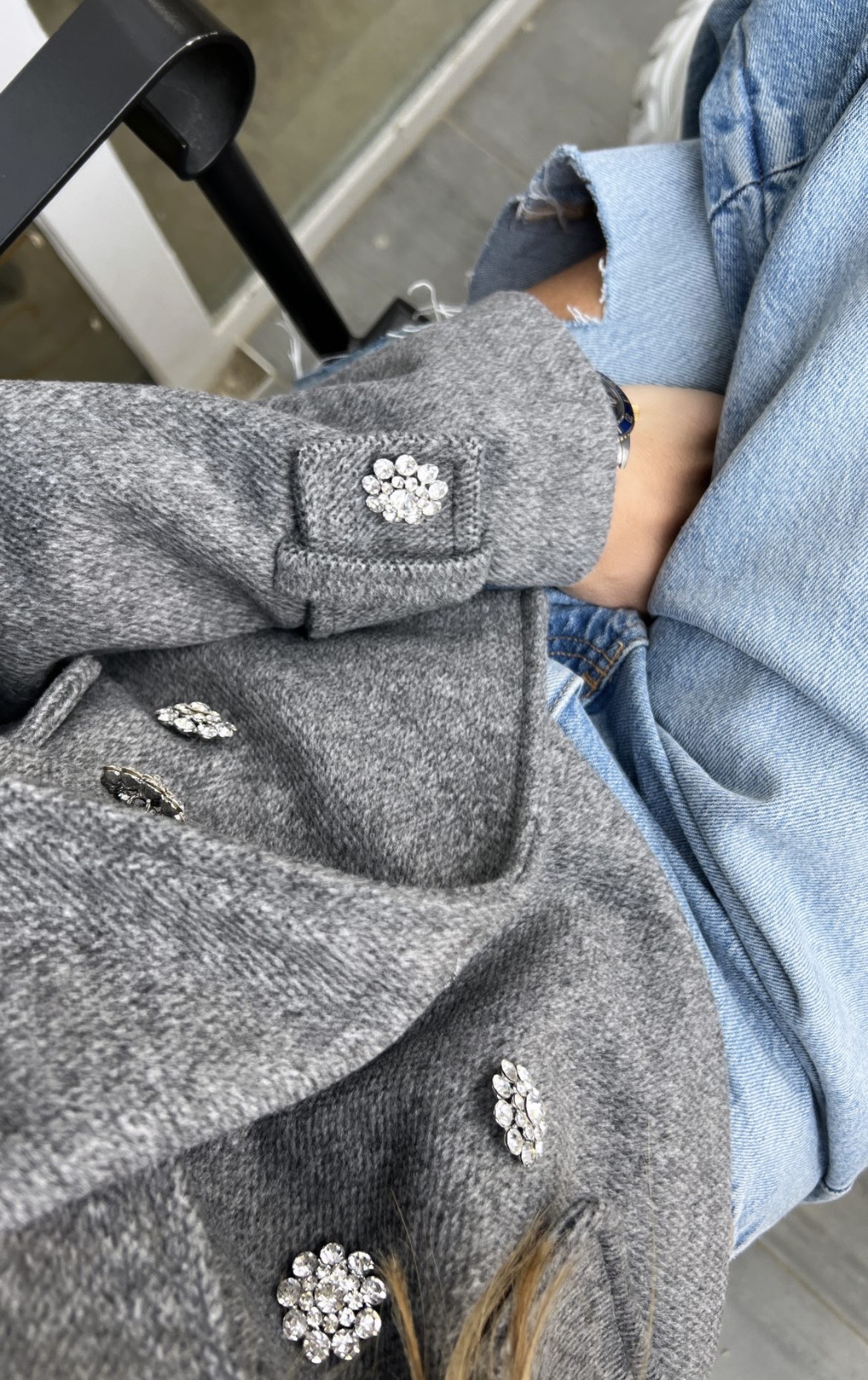 Short grey jacket with crystal buttons